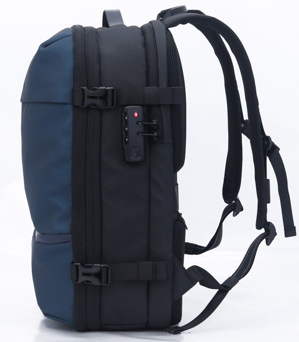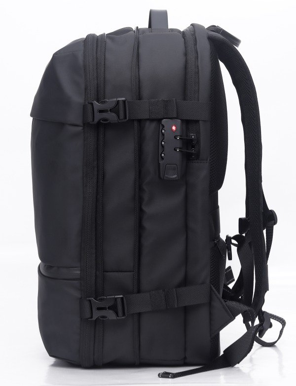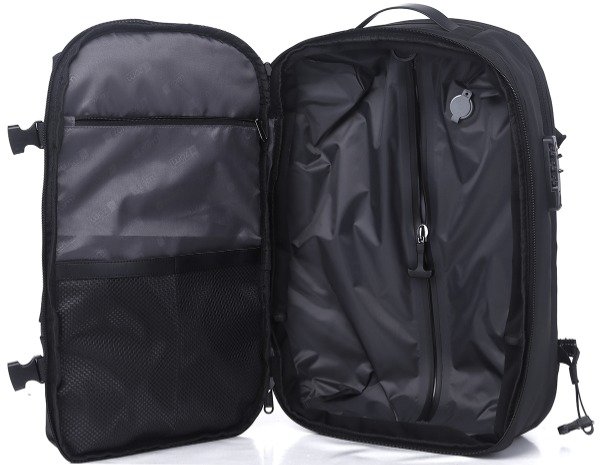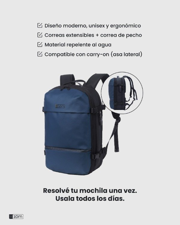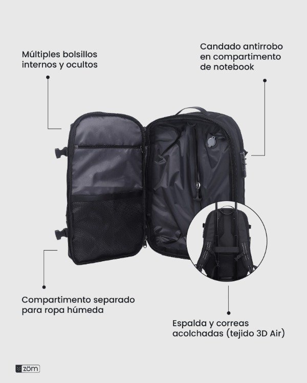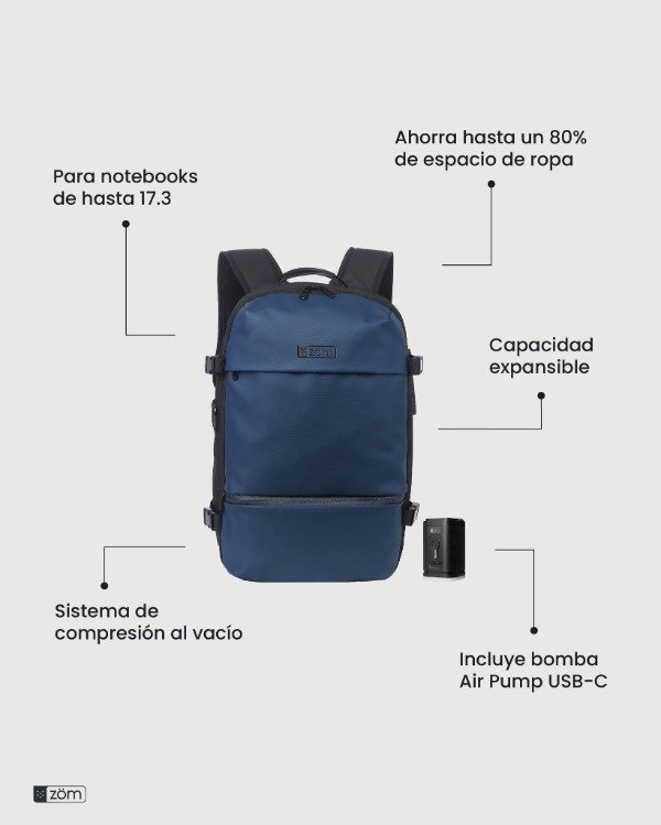 Características Mochila para notebooks de hasta 17.3 Sistema de compresión al vacío con bomba de aire incluida Capacidad expansible que permite ahorrar un 80% de espacio de ropa Candado de combinación anti robo Múltiples bolsillos y compartimientos para llevar tus pertenencias ordenadas Bolsillo separado para separar ropa sucia o húmeda Poliéster de alta calidad con tratamiento water repellent Correas y espalda acolchadas (aire 3D) Correa de pecho con cierre click Asa superior y Asa Lateral Correa para colocar en Carry-On Bolsillos | Cierres 1 Compartimiento principal muy amplio con cierre y sistema de sellado al vacío, bolsillo con cierre y 2 bolsillos de red. 1 Compartimiento especial con bolsillo porta notebook de hasta 17.3 con candado de seguridad y bolsillos varios 1 Compartimiento adicional con espacio de guardado, bolsillo con cierre y 2 bolsillos de red 2 Bolsillos frontales con cierre de fácil acceso Bolsillo dorsal oculto con cierre Bolsillo lateral con cierre y elástico para botella | termo personal